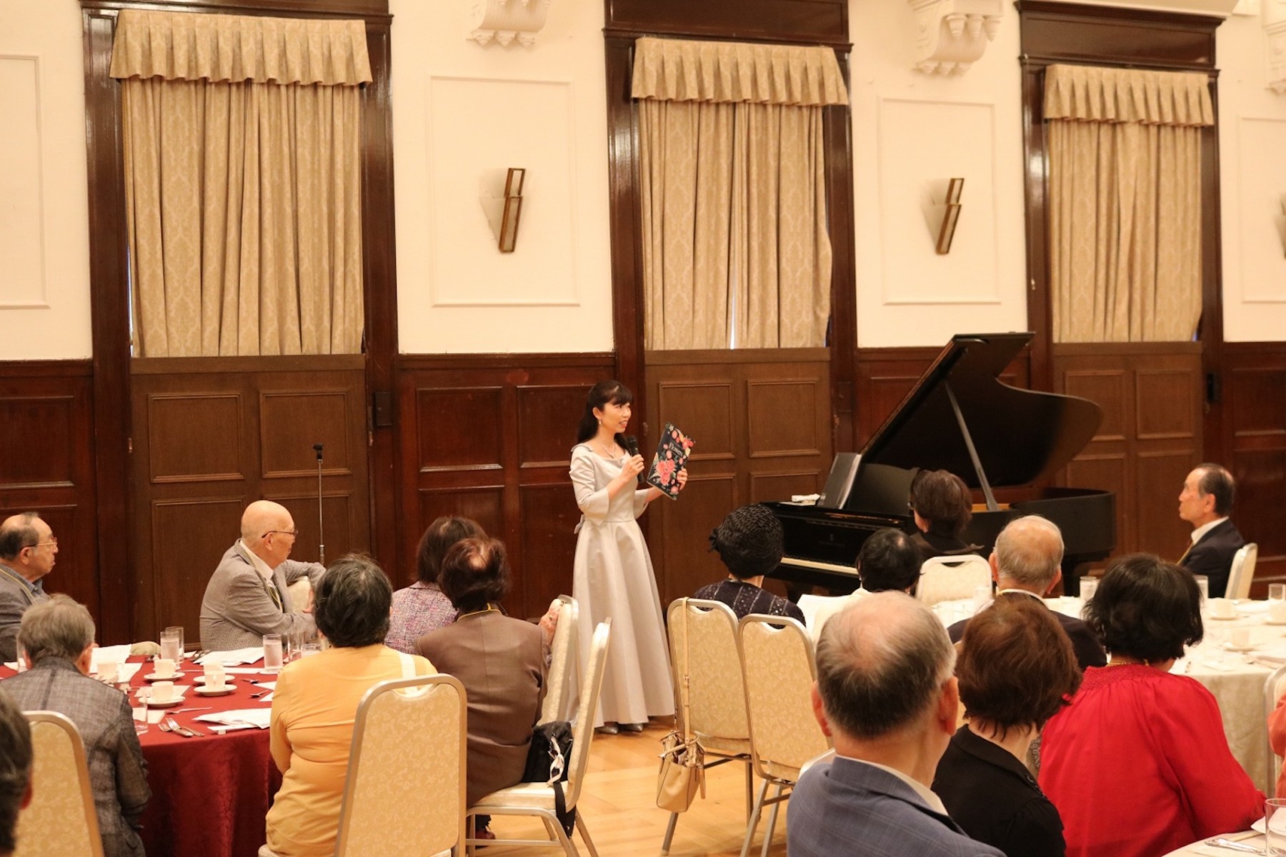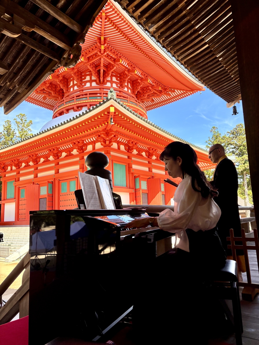 昼の「お大師さま一代記」は金堂裏で行いました。その日の夜の「佛のひびき」が行われた根本大塔wをバックに。